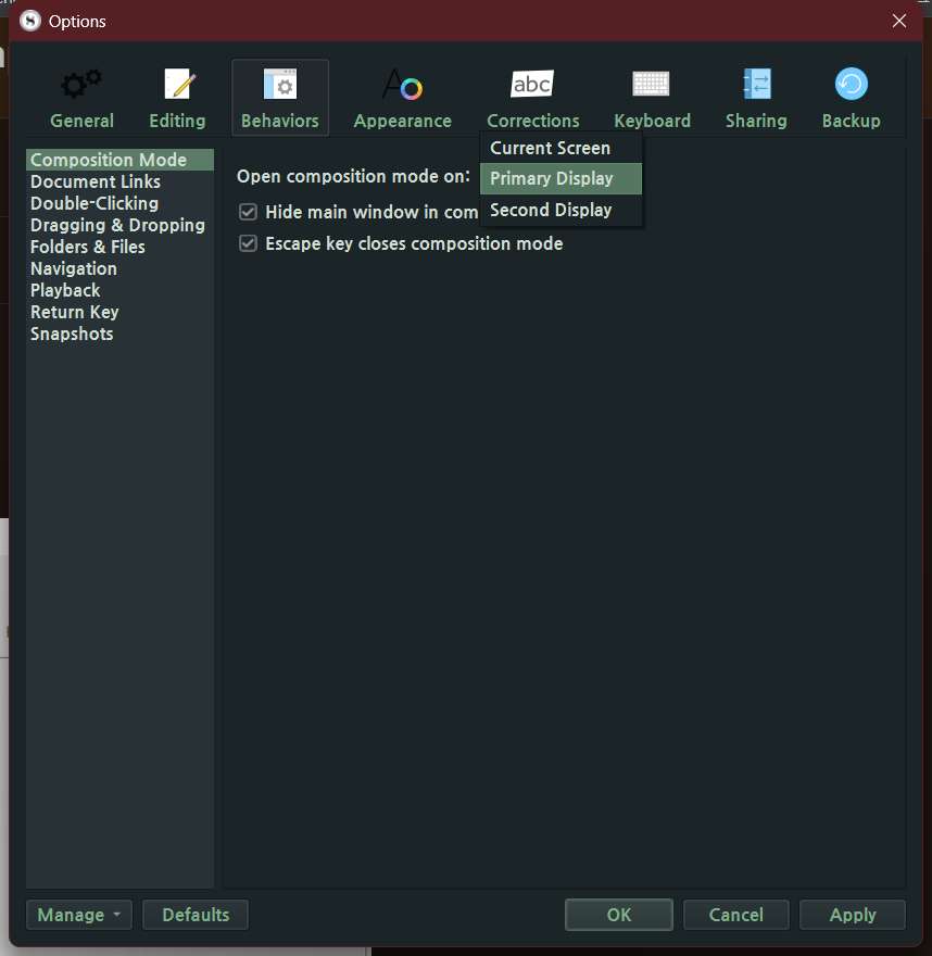 ์ผ๋ก ์ค์ ์ ๋ฐ๊ฟ์ฃผ๋ฉด, ์ปดํฌ์ง์ ๋ชจ๋ ์ง์ ์ง์ ์ ์ฐฝ์ด ์๋ ๋ชจ๋ํฐ์์ ์ปดํฌ์ง์ ๋ชจ๋๋ก ์ง์ ํฉ๋๋ค.